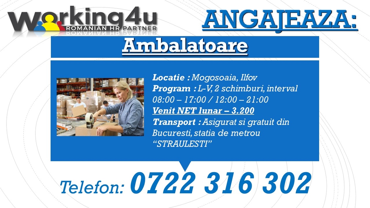 Angajam ambalatoare pentru distribuitor de hrana animale de companie cu depozitul in Mogosoaia. Program L-V, 2 schimburi, transport de la Straulesti. Pentru info sunati la tel.