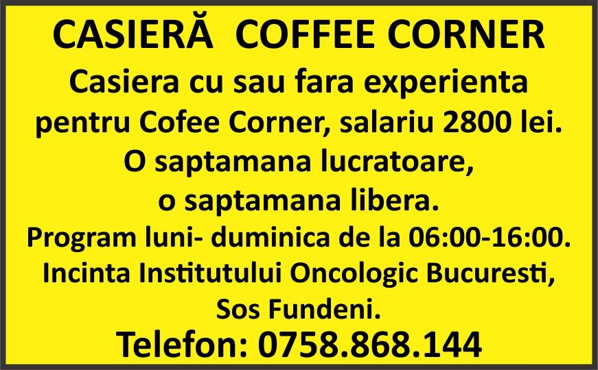 Casiera cu sau fara experienta pentru Cofee Corner, salariu 2800 lei. O saptamana lucratoare, o saptamana libera. Program luni-duminica de la 06:00-16:00,