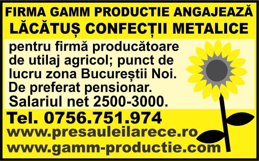 Pentru firma producatoare de utilaj agricol, punct de lucru , zona Bucuresti noi, de preferat pensionar, salariul net 2500 -3000 , tel 0756751974