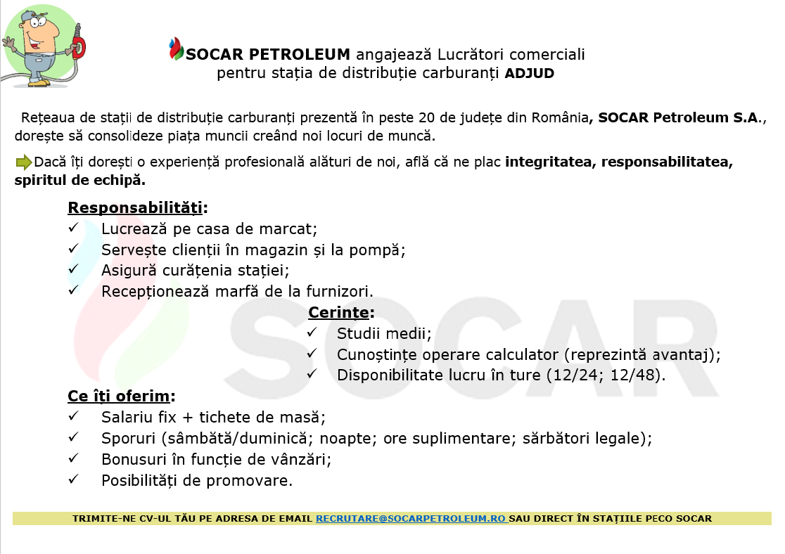 poti trimite CV-ul tau pe email sau poti merge direct in statia Peco Socar din Adjud.