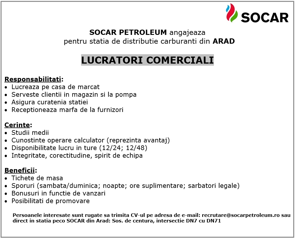 SOCAR angajeaza lucratori comerciali in statia peco Arad. Persoanele interesate ne pot trimite CV-ul pe email sau se pot adresa direct in statia peco (Sos. de centura).