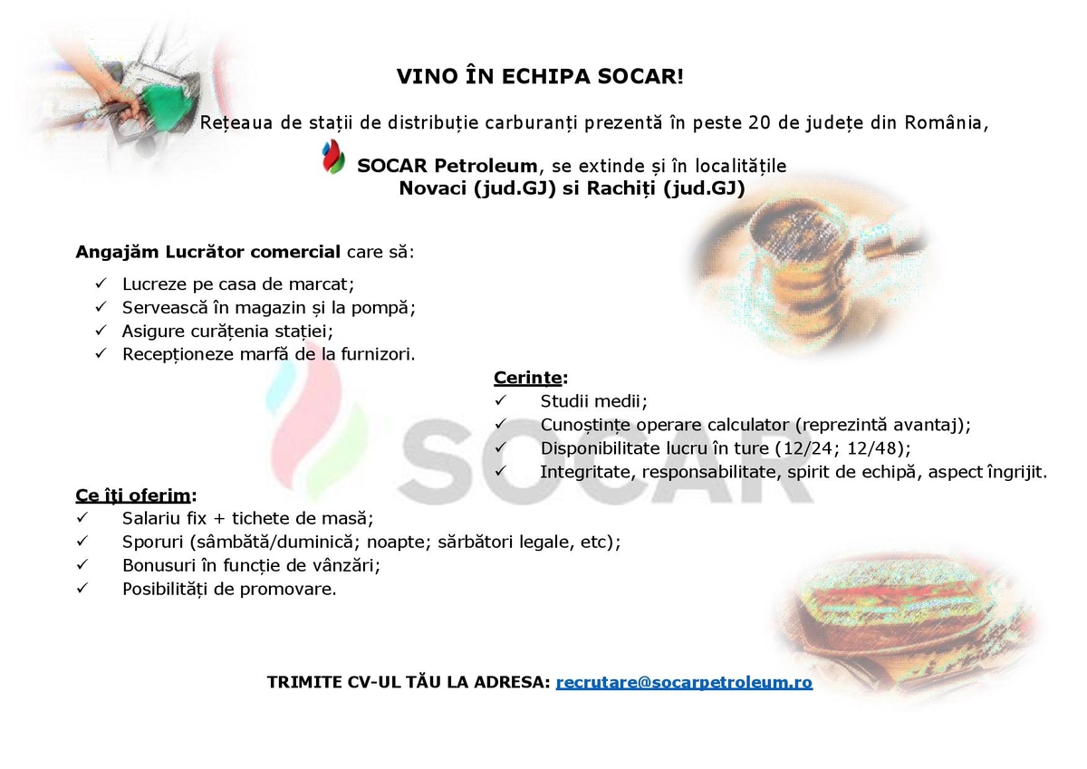 SOCAR angajeaza lucratori comerciali in statiile peco Novaci si Rachiti din judetul Gorj. Persoanele interesate ne pot trimite CV-ul pe email recrutare@socarpetroleum.ro sau pot lasa un CV direct in statiile peco, astfel: