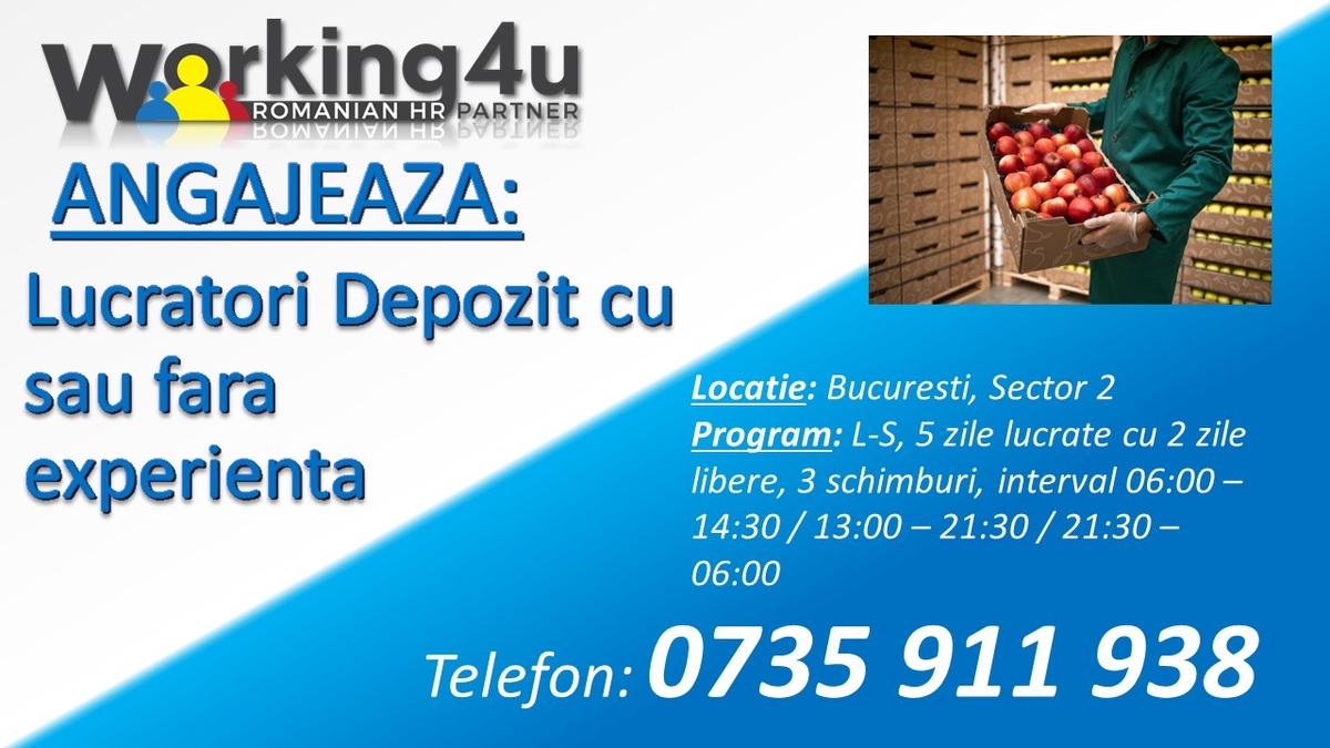 Pentru angajari, trimiteti CV-ul Dvs. pe adresa de e-mail r e c r u t a r e @ w o r k i n g 4 u . r o sau contactati-ne la numarul de telefon 0735 911 938.