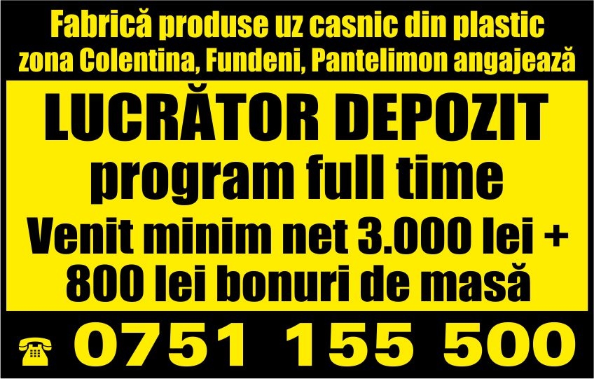 Fabrica produse uz casnic din plastic zona Colentina, Fundeni, Pantelimon angajeaza lucrator depozit program full time.