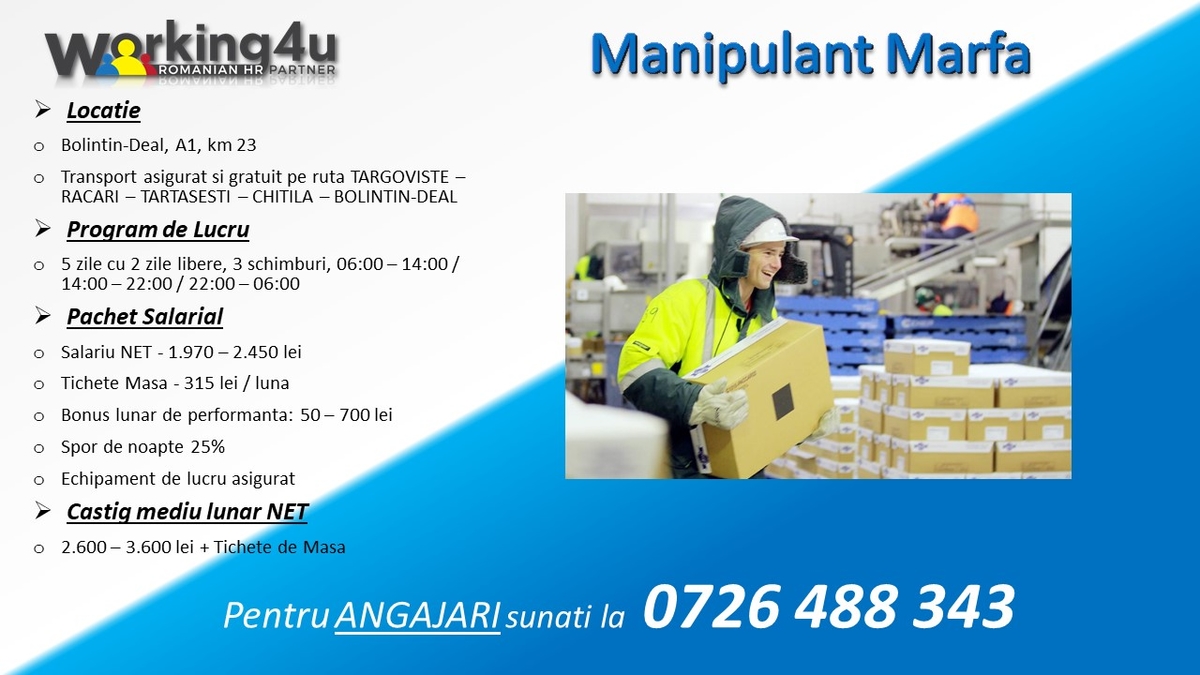 Pentru clientul nostru, cel mai mare producator si distribuitor de mezeluri si produse din carne, cu punctul de lucru in Loc. Bolintin-Deal, Jud. Giurgiu, (Autostrada A1, Bucuresti-Pitesti, km. 23) recrutam noi colegi pentru pozitia de Manipulant Marfa.
