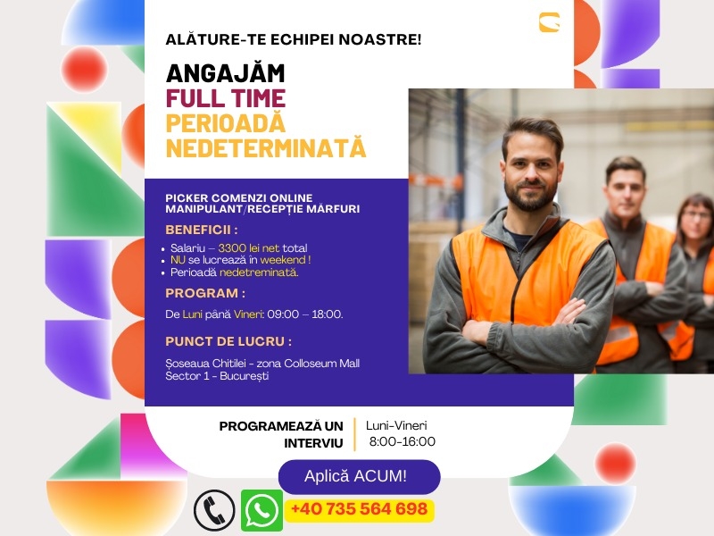 Salariu 3300 lei NET, contract perioada nedeterminata, program L-V: 09:00 - 18:00, zona: sector 1 - dupa Colosseum Mall