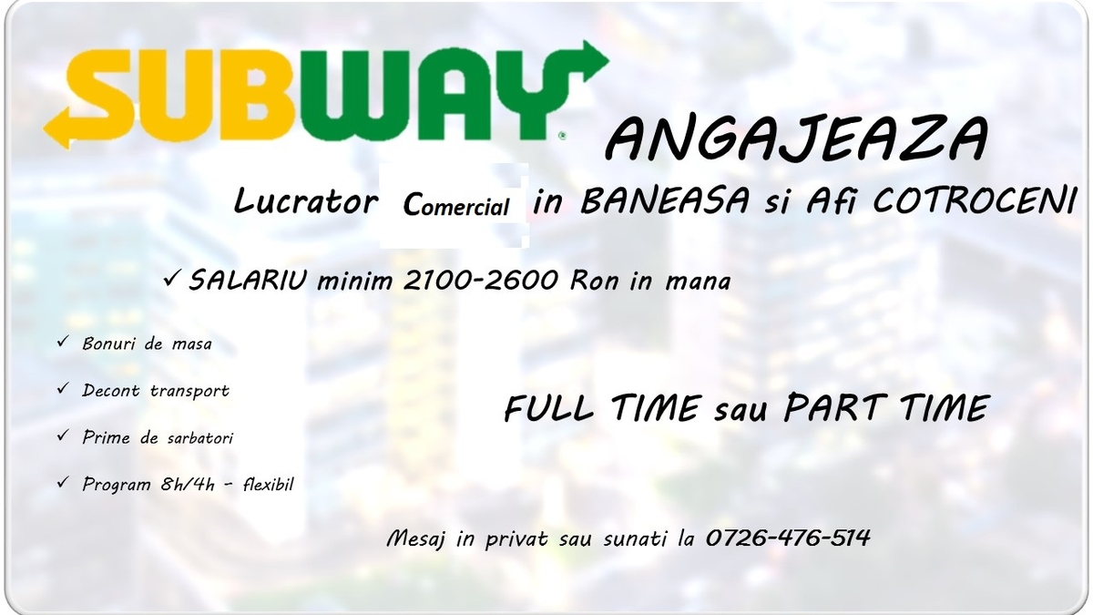 Angajam lucrator comercial (preparator sandwich) pentru SUBWAY Baneasa si SUBWAY Afi Cotroceni, program in ture, mediu de lucru placut, salariu intre 2100 - 2600 RON, detalii la interviu (0726.476.514 - claudiu.subway@gmail.com)