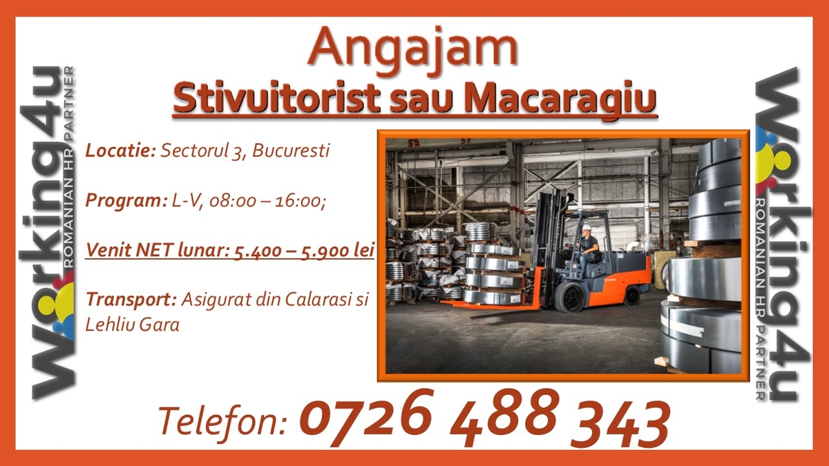 Pentru clientul nostru, companie specializata in prelucrarea si distributia produselor din otel cu sediul situat in Sectorul 3, Bucuresti, suntem in cautare de noi colegi pentru postul de stivuitorist sau macaragiu.