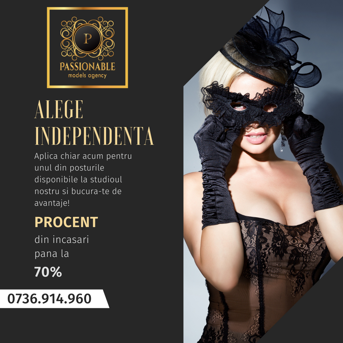 Passionable Models Agency isi extinde echipa. Oferim modelelor conditii excelente, seriozitate si confidentialitate, venit minim garantat, bonus de angajare si comision din incasari de pana la 70%,