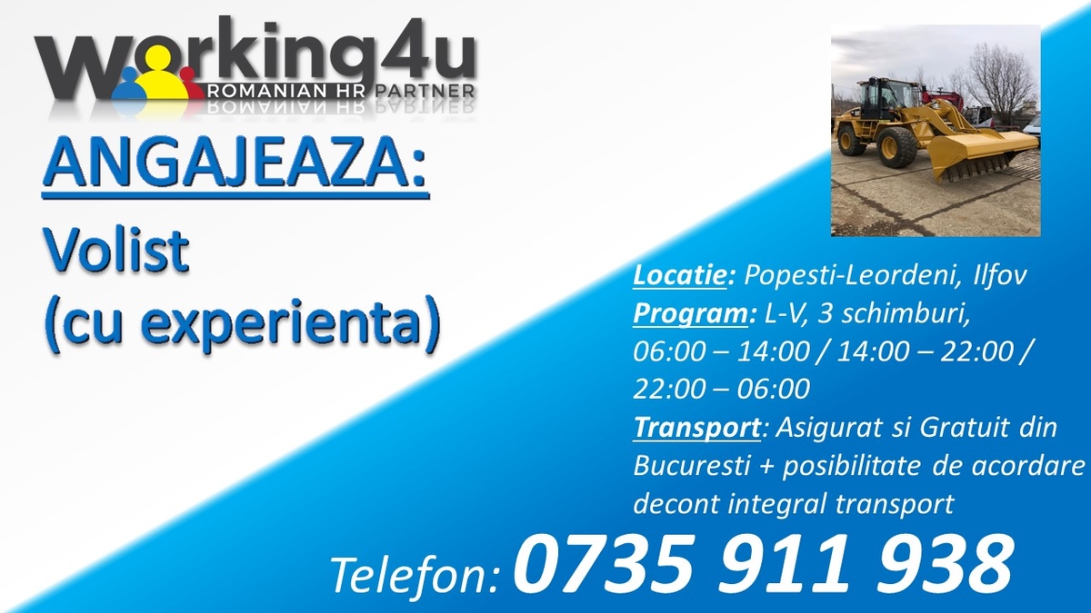 Pentru angajari, trimiteti CV-ul Dvs. pe adresa de e-mail r e c r u t a r e @ w o r k i n g 4 u . r o sau contactati-ne la numarul de telefon 0735 911 938.