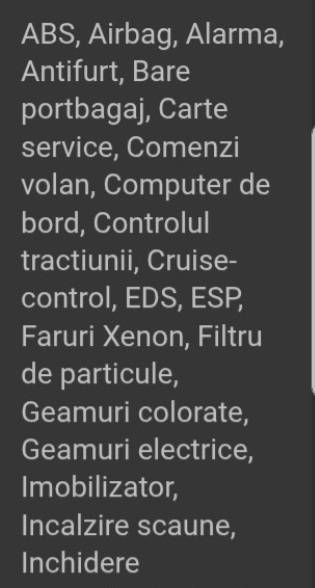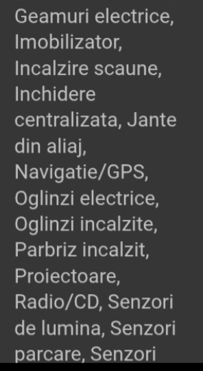 Optiuni confort: Geamuri electrice Oglinzi incalzite Tapiterie piele Aer conditionat Inchidere centralizata Parbriz incalzit Scaune incalzite Trapa Comenzi volan Jante aliaj Pilot automat Senzori parcare Usi 4+1 Computer bord Oglinzi electrice Radio cd Sistem navigatie Volan reglabil
