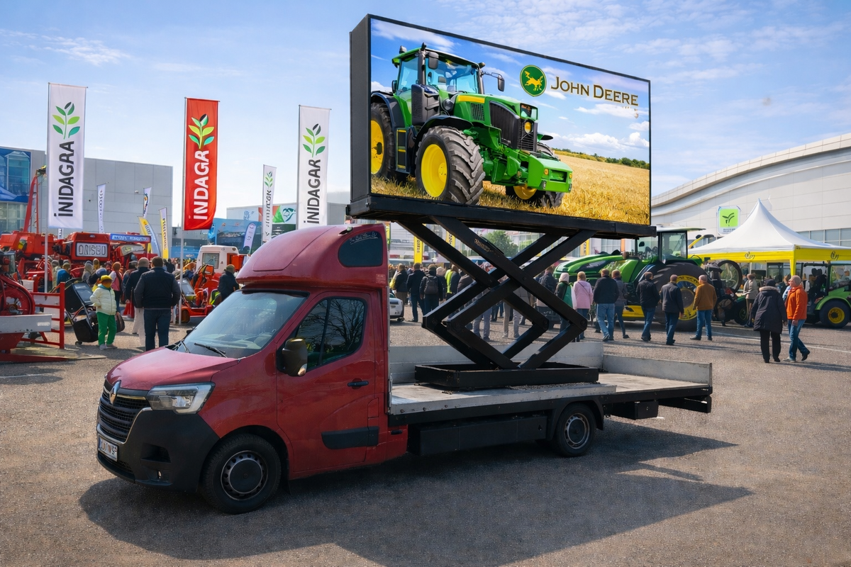 Inchiriem ecran LED mobil montat pe platforma auto, ideal pentru evenimente, promovare outdoor si campanii cu impact vizual puternic.