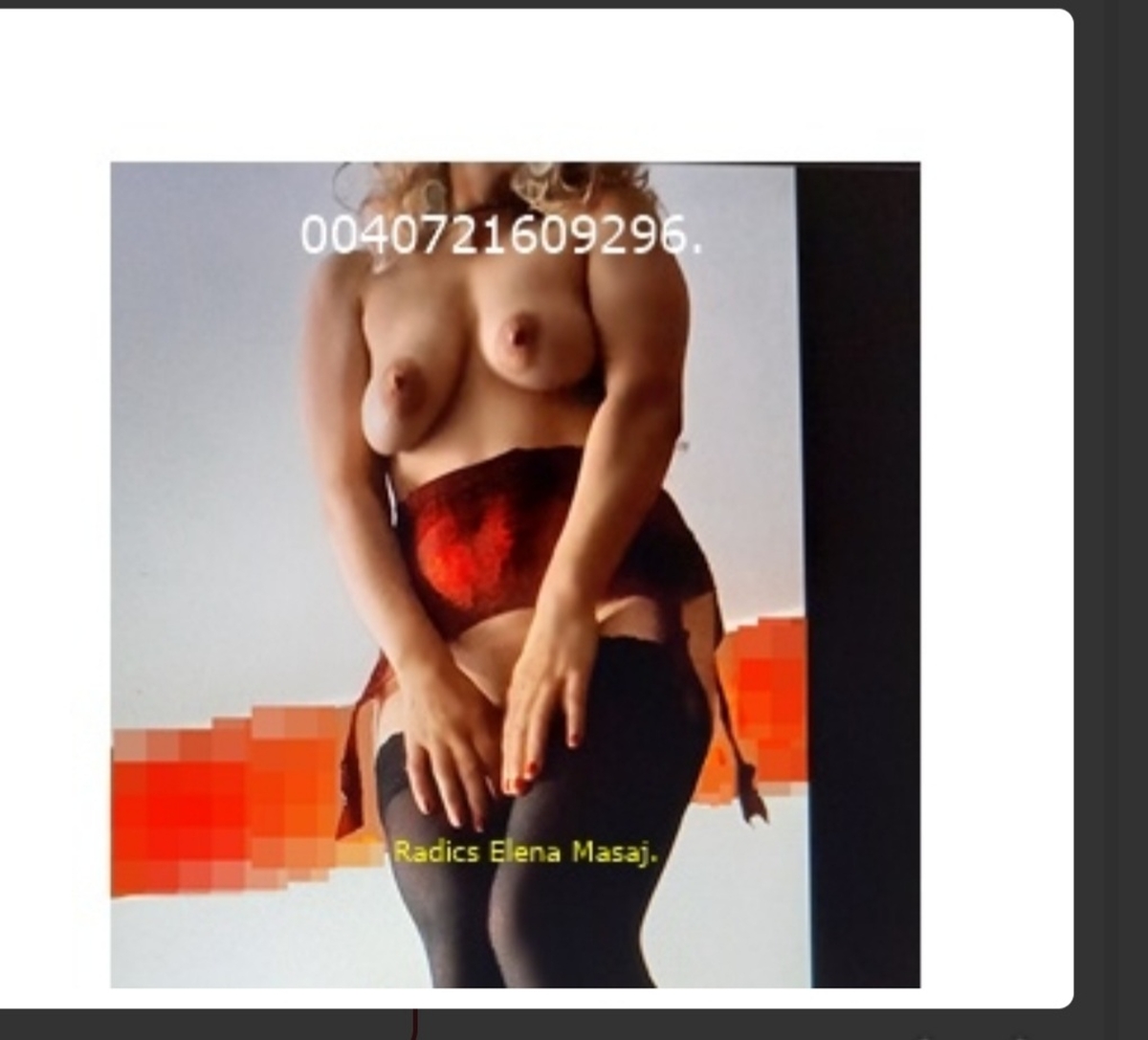 Vei observa igiena, liniste atmosfera relaxanta si vreau sa te bucuri in compania mea si te vei simti bine primit. Pot sa-ti explic pe video, apel pt. masaj erotic, nuru si servicii totale pe Whatsapp, Instagram, eu sunt elena.radics.masaj. Confirm pozele cum doresti, cu apel web, real, ca in poza, topless dantela rosie, jartiere cu ciorapi lycra etc. Pupici.