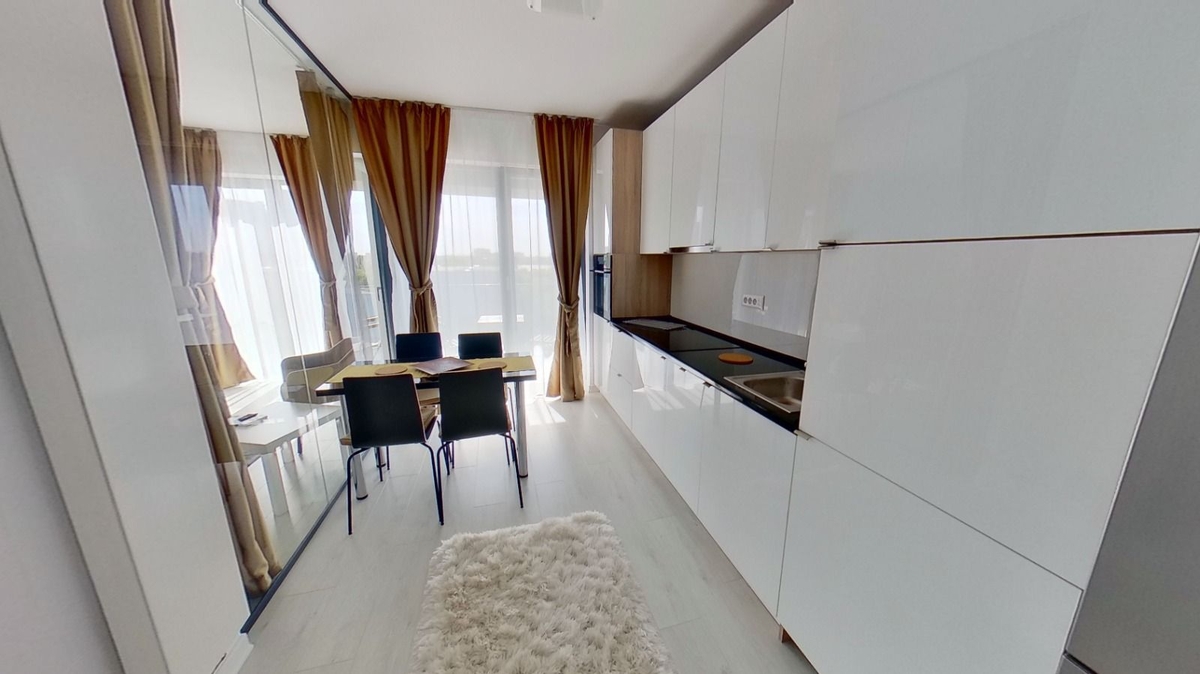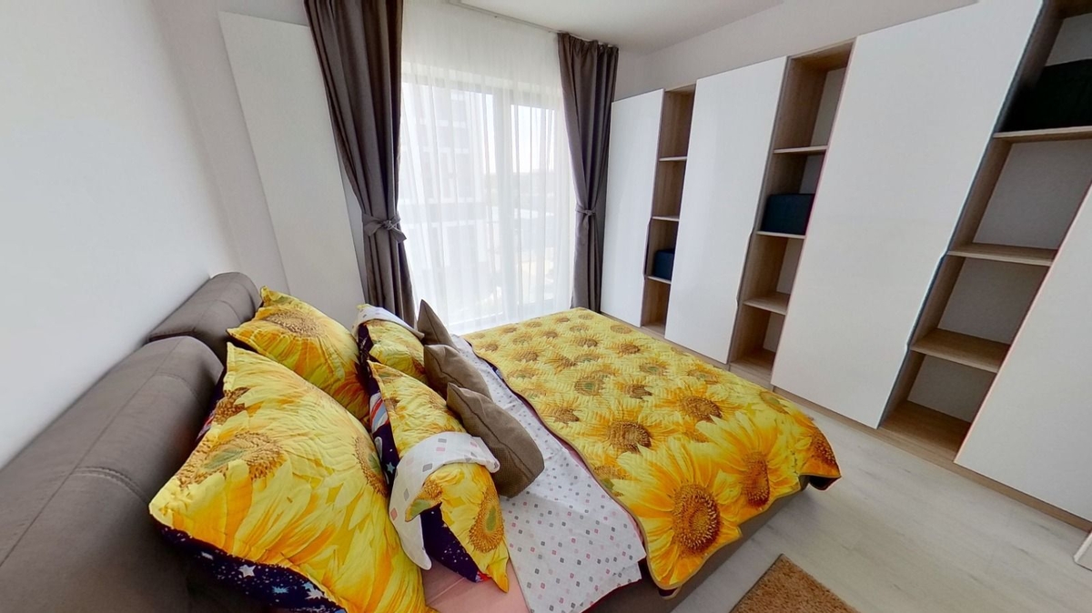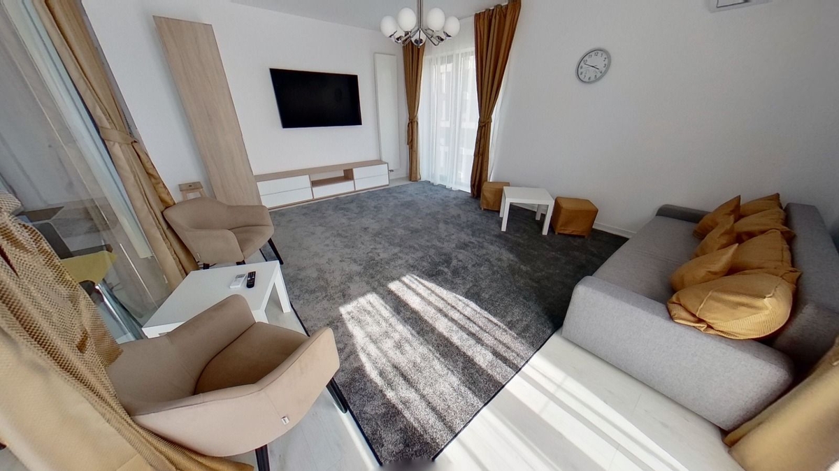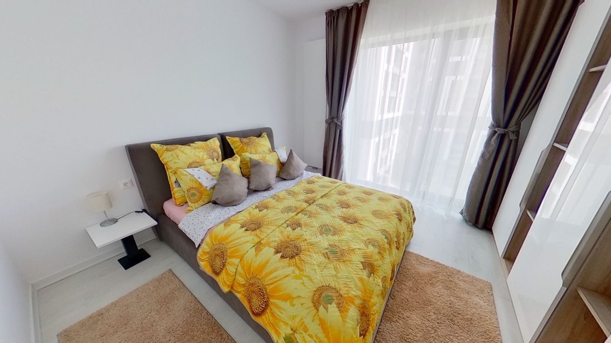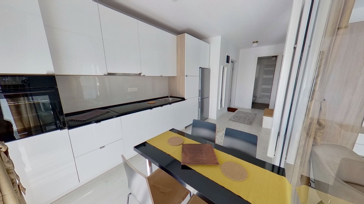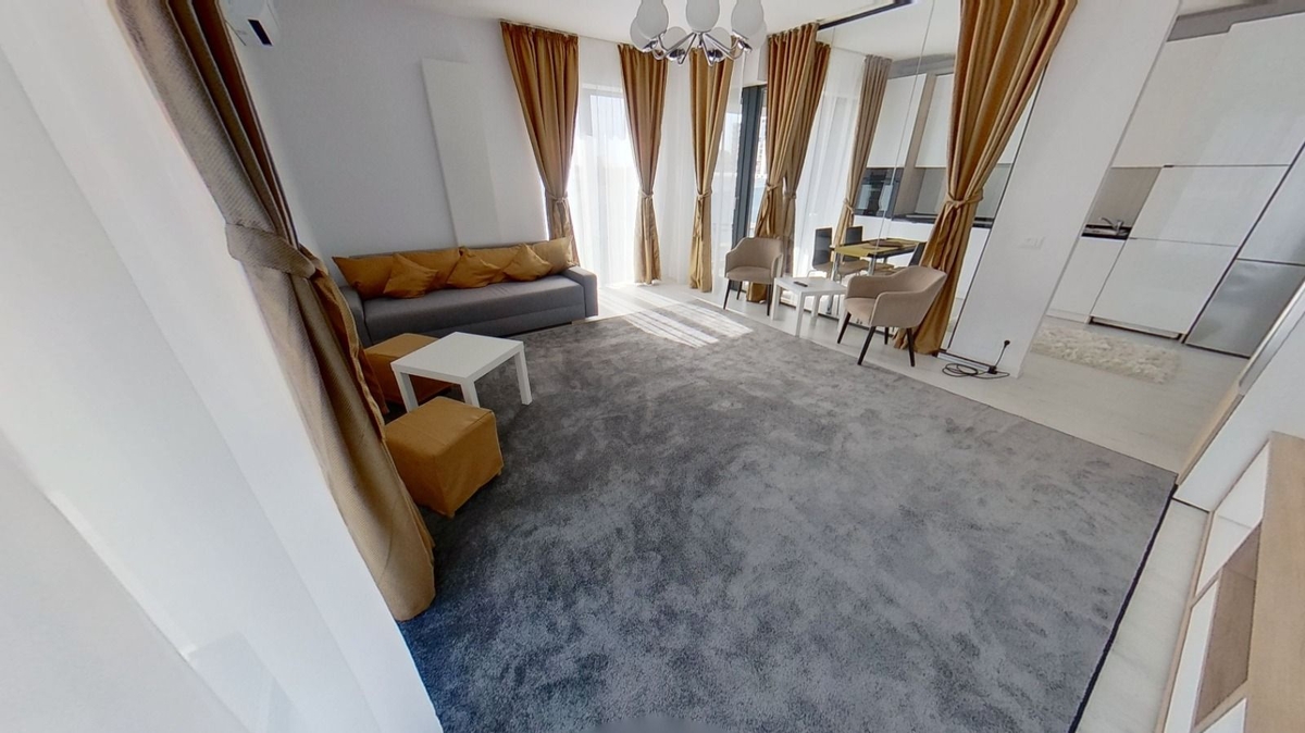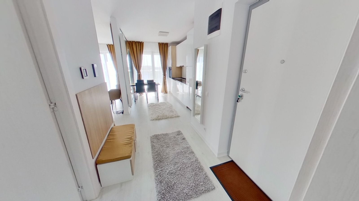 Apartamentul de 2 camere este situat la etajul 4 din 11, vedere catre sud in complexul Cloud 9, se afla la prima inchiriere si dispune de o suprafata utila de 65 mp. Apartamentul este mobilat si utilat complet : aer conditionat, masina de spalat rufe cu uscator, masina de spalat vase ,cuptor microunde, televizor. SAMSUNG SMART, plita pe inductie si cuptor electric.