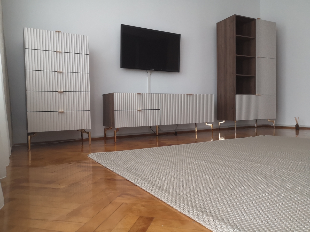 Dotari: masina de spalat rufe, cuptor cu microunde, aragaz, cuptor, frigider, centrala apartament, aer conditionat, 2 televizoare, loc de parcare ADP.