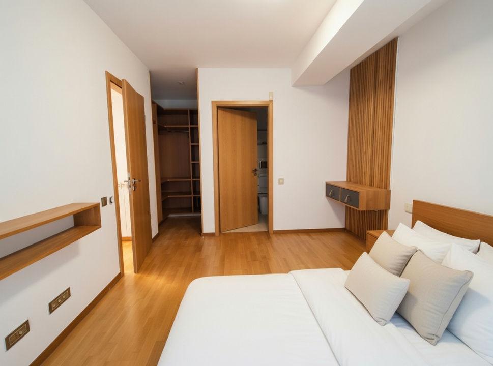 Apartamentul este proaspat renovat, se inchiriaza complet mobilat si utilat si este compartimentat dupa cum urmeaza: Living spatios cu bucatarie deschisa, dormitor matrimonial cu baie proprie si dressing, 2 grupuri sanitare, multiple spatii de depozitare, loc de parcare subteran inclus in pret.