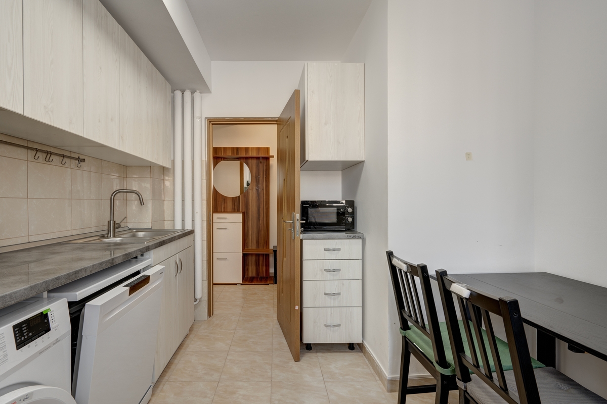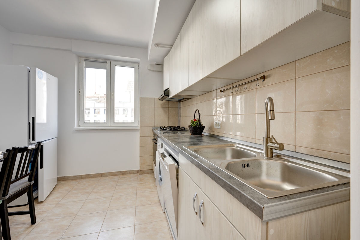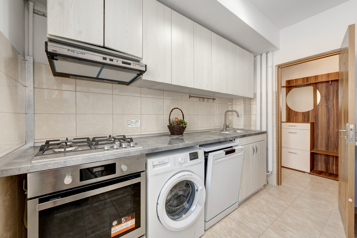 In bucatarie ai masina de spalat vase, masina de spalat rufe, cuptor, plita, hota, combina frigorifica, cuptor cu microunde, toate noi.