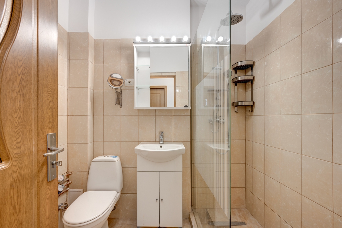 In baie a fost montata o cabina de dus mare si practica.