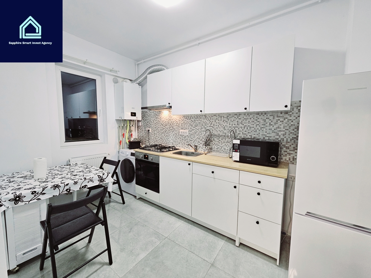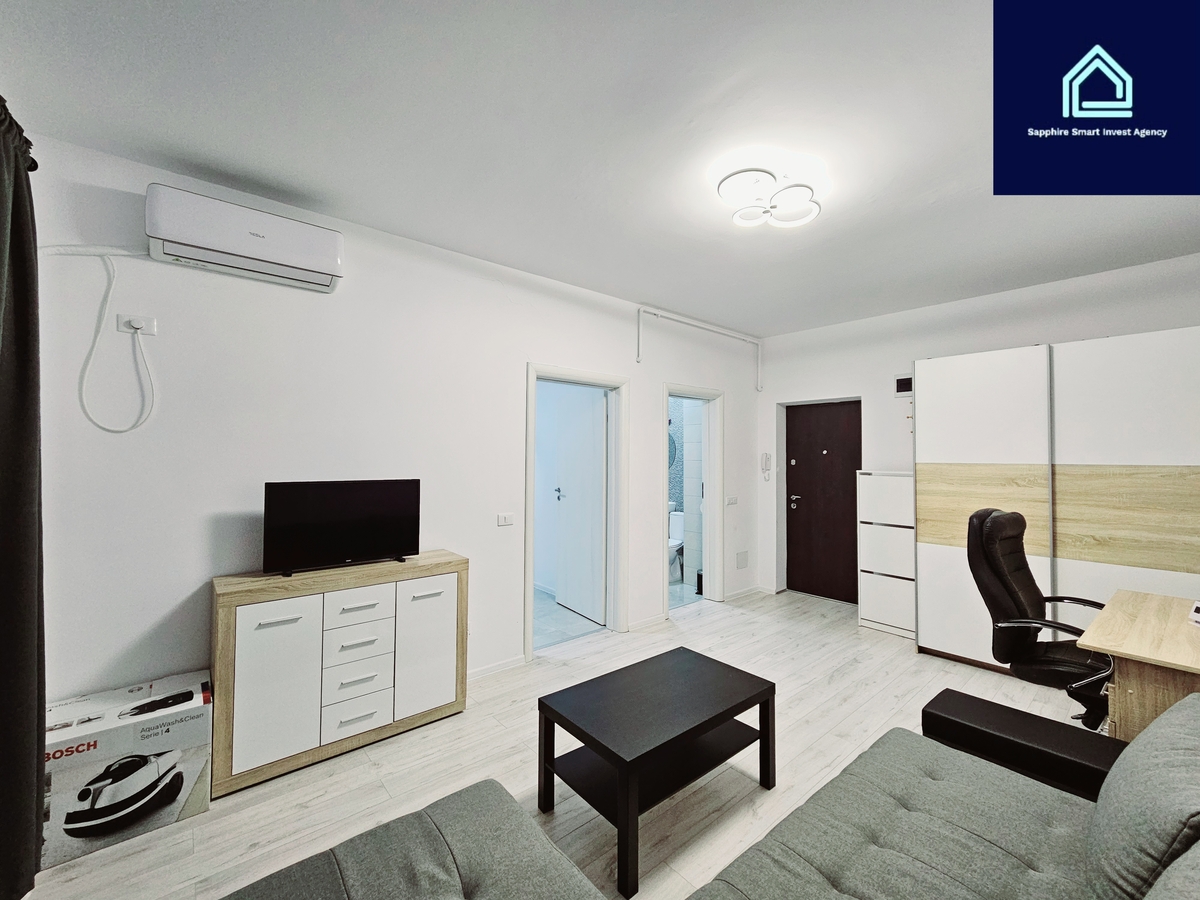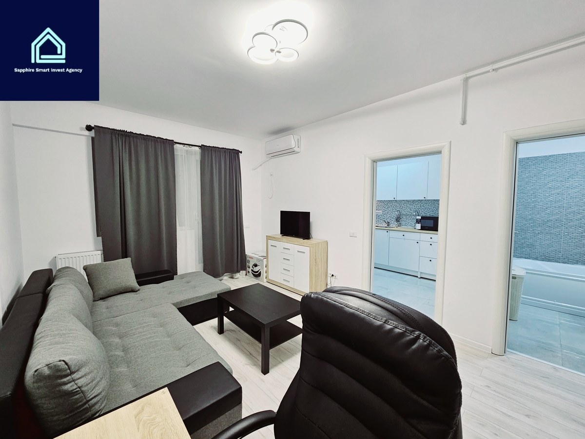 Inchiriez garsoniera situata in complexul Envogue Residence, cu o suprafata utila de 37 mp, totul nou, mobilata si utilata complet (centrala termica, aer conditionat, masina de spalat cu uscator, hota, plita, cuptor, combina frigorifica, TV diag. 81 cm, aspirator, etc.), va puteti muta doar cu hainele.