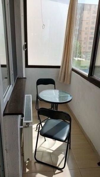 Balcon: inchis cu termopan, plase de tantari, ferestre, izolat termic si incalzit cu calorifer, masuta de cafea cu doua scaune, dulap de stocare, draperie, vedere spre parcare si parc.