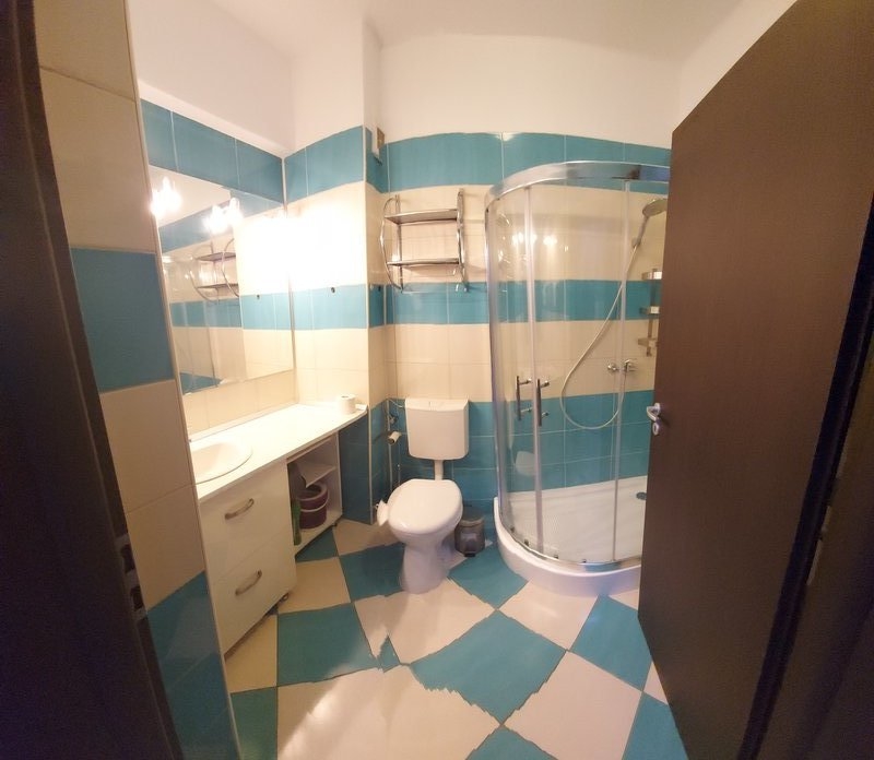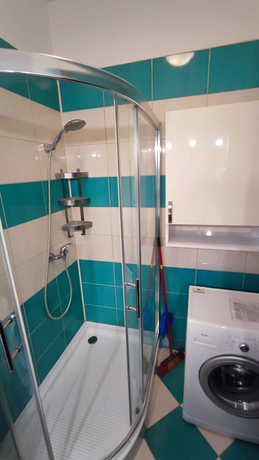 baie: masina de spalat rufe, chiuveta de blat, dulap cu 3 sertare, oglinda f mare - 1,2 × 0,9 m, uscator par, priza 110- 220V, cabina dus 1.6 x 1 m, usi anticalcar, sistem de ventilatie, gresie, faianta