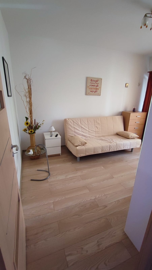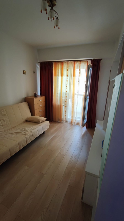 Camera: canapea extensibila de 3 persoane, cu saltea 18 cm din latex, care va asigura un somn foarte confortabil, comoda 4 sertare, biblioteca cu 2 dulapuri, 2 sertare, TV , termostat de ambient, noptiera cu veioza, masuta de cafea, ferestre si usa termopan de acces in balcon, parchet 12 mm, cu izolare termica si fonica, perdele, draperii.