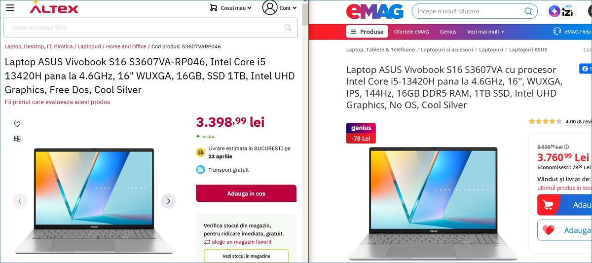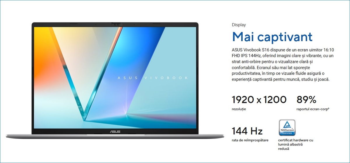 Vand laptop NOU, nefolosit, in cutie, garantie 2 ani eMAG - ASUS Vivobook S16 M3607VA (model 2025) cu procesor Intel Core i5-13420H pana la 4.6GHz, ecran vibrant de 16'' fluid 144Hz, memorie 16GB DDR5 RAM, stocare 1TB SSD, placa video Intel UHD Graphics, culoare Cool Silver , sistem operare Windows 11 instalat, Microsoft Office, pregatit pt utilizare.