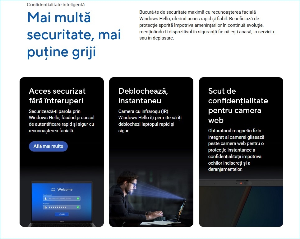 • Wi-Fi 6, bluetooth, sunet de calitate Dolby Atmos, camera FHD cu senzor IR cu scut de confidentialitate;