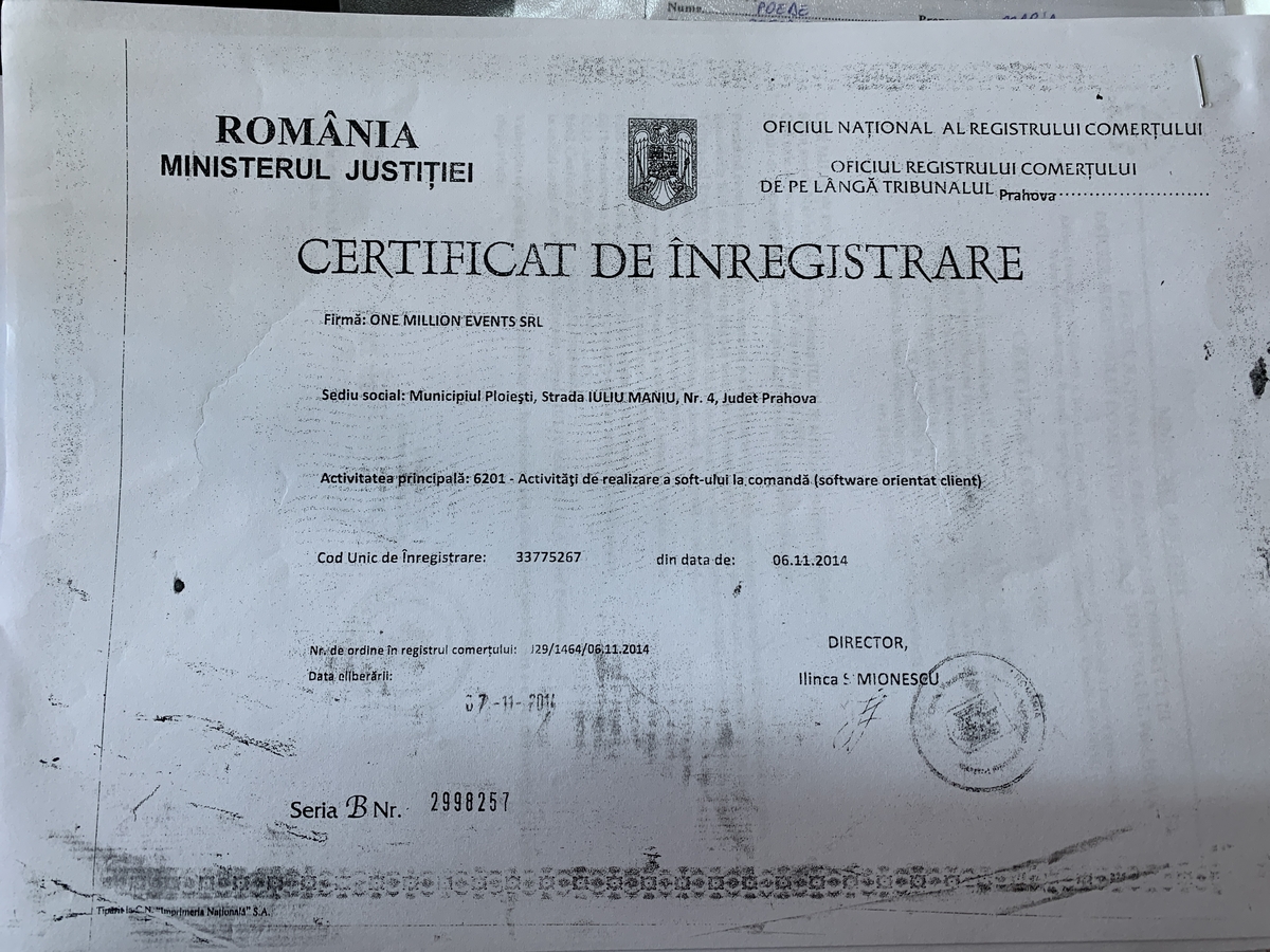 SC One Million Events SRL cu sediul in Ploiesti, str. Iuliu Maniu nr. 4, CIF: 33775267 si J29/1464/06.11.2014 declara pierdut certificatul de inregistrare Seria B, nr: 2998257 si este considerat nul.