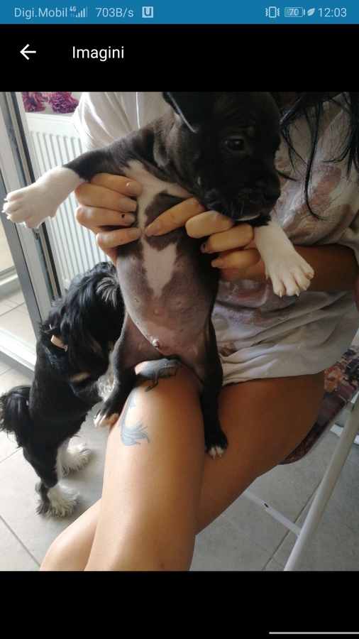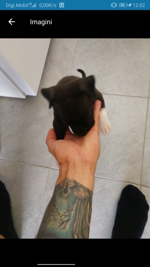 Vând pui amstaff născut pe 24 august, din tata maro cu alb și pedigree și din mama negru cu alb amstaff cu pitbull, în vârstă de 5 săptămâni nu are vaccin sau carnet fiindca este foarte mic, se pot începe vaccinurile de la data de 1 octombrie, a fost la veterinar este sănătos și foarte jucăuș.