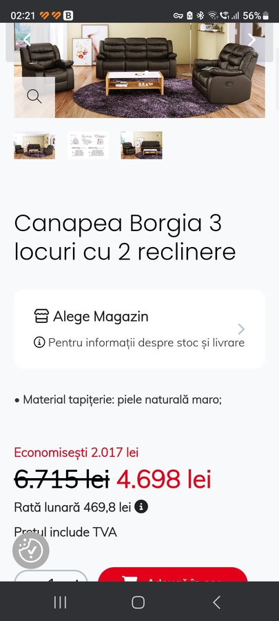 Vand canapea piele cu reclinere Borgia in stare foarte buna.