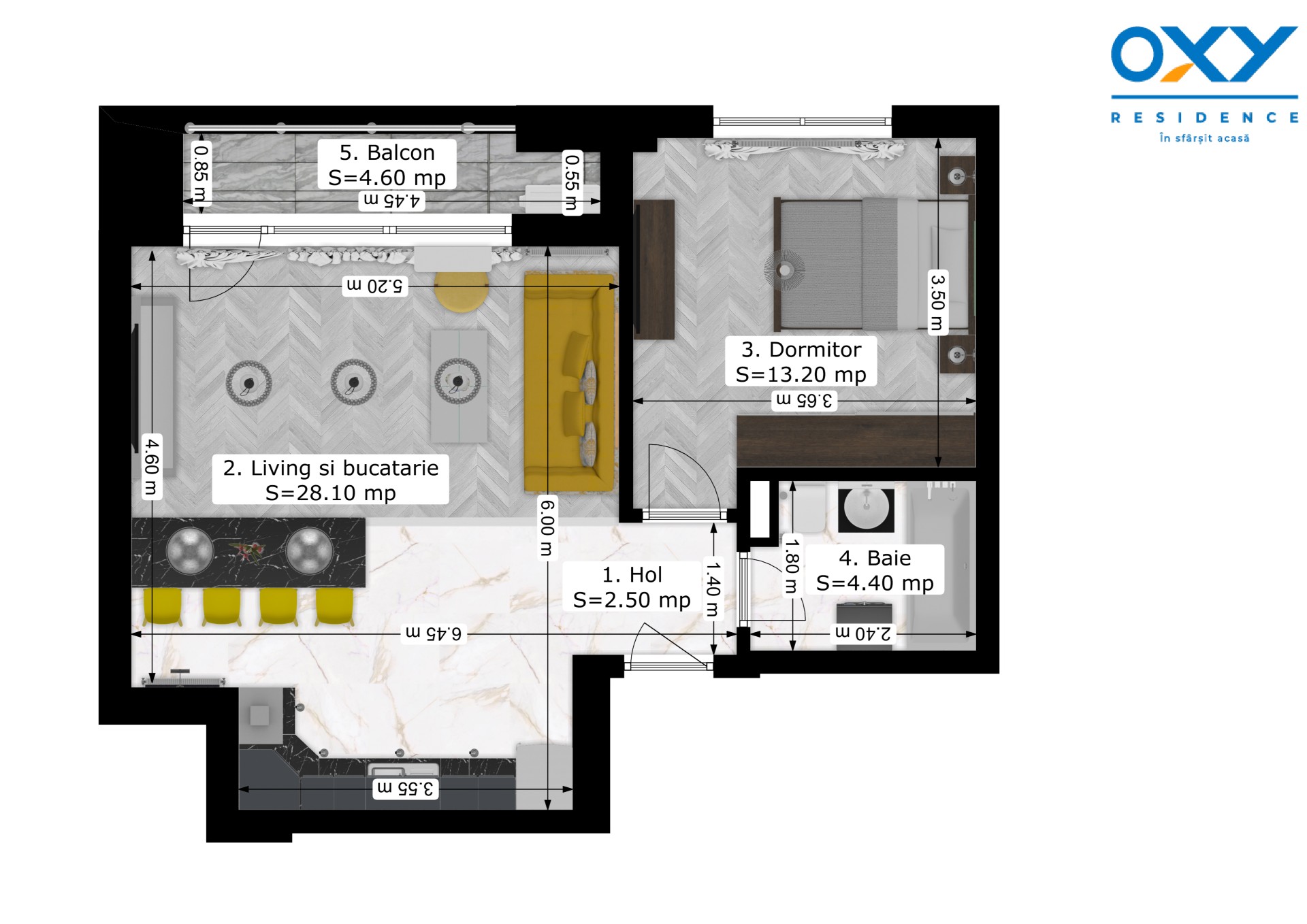 Apartamentul cu 2 camere Tip F, face parte din ansamblul rezidential Oxy Residence 2, situat la 20 de minute de Piata Unirii, in cartierul Bucurestean Rahova, pe Sos. Bucuresti-Magurele nr. 82W (chiar in statia STB Slatina), Sector 5, avand o suprafata total utila de 52.80 mp, fiind compus din hol-2.50 mp, living si bucatarie open space-28.10 mp, dormitor 13.20 mp, baie-4.40 mp si balcon-4.60 mp.