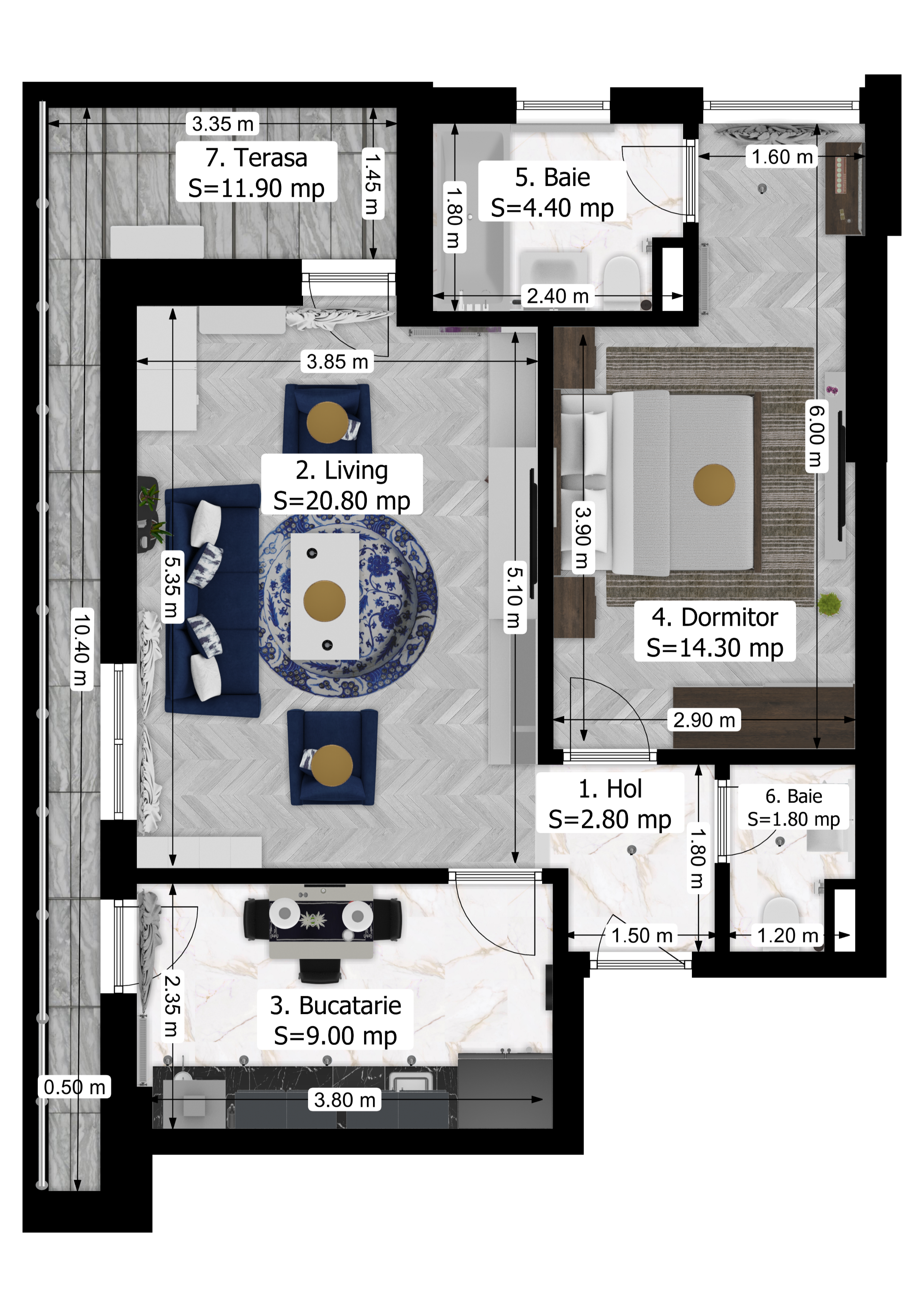 Apartamentul cu 2 camere Tip M, face parte din ansamblul rezidential Oxy Residence 2, situat la 20 de minute de Piata Unirii, in cartierul Bucurestean Rahova, pe Sos. Bucuresti-Magurele nr. 82W (chiar in statia STB Slatina), Sector 5, avand o suprafata total utila de 65.20 mp, fiind compus din hol-2.80 mp, living-20.80 mp, bucatarie-9.00 mp, dormitor-14.30 mp, baie-4.40 mp, grup sanitar-1.80 mp si terasa-11.90 mp.