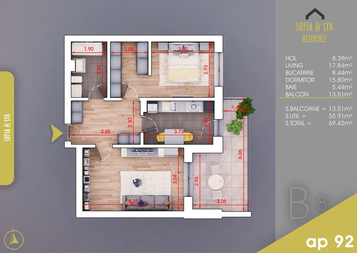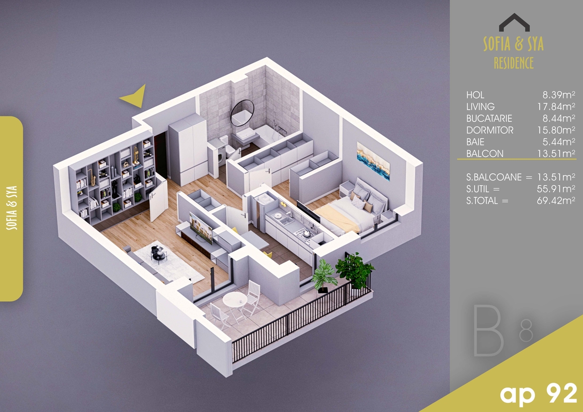 Apartamentul este decomandat si are o suprafata totala de 69.42 mp. Aceasta este alcatuita din: o camera de zi spatioasa, o bucatarie, o baie, un hol si un balcon cu acces din camera de zi si bucatarie.