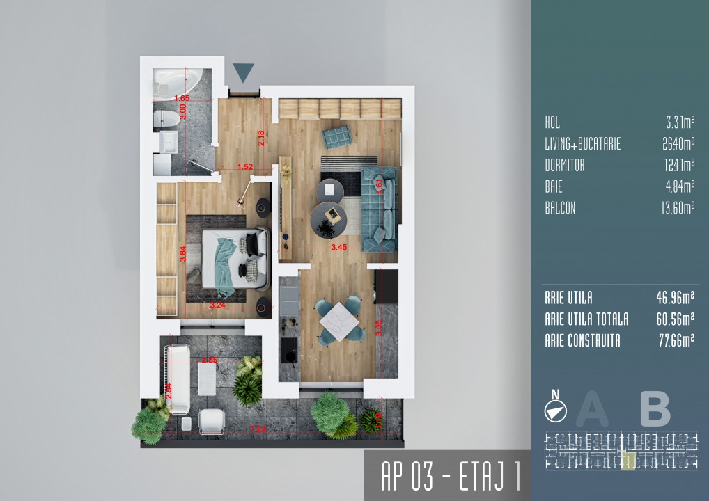 Va prezentam spre vanzare un apartament cu 2 camere tip studio avand o suprafata utila de 60,56 mp cu o terasa de 13,60 mp, disponibil la etajul 1 intr-un imobil cu regim de inaltime D+P+11E.