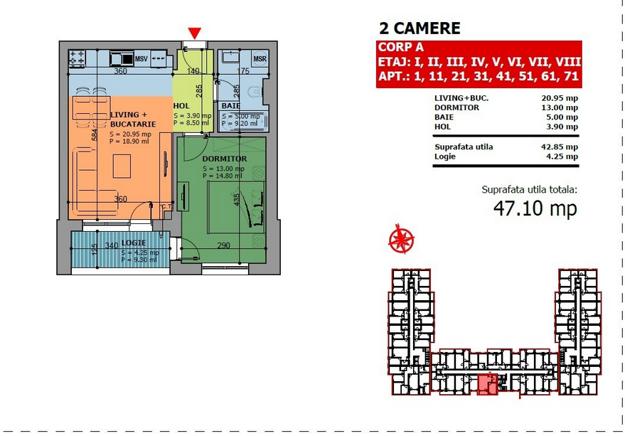 Apartament 2 camere decomandat, aflat la Etaj 1, confort 1, cu o suprafata utila de 47.1 m² . Locuinta este intr-un imobil de 8 etaje