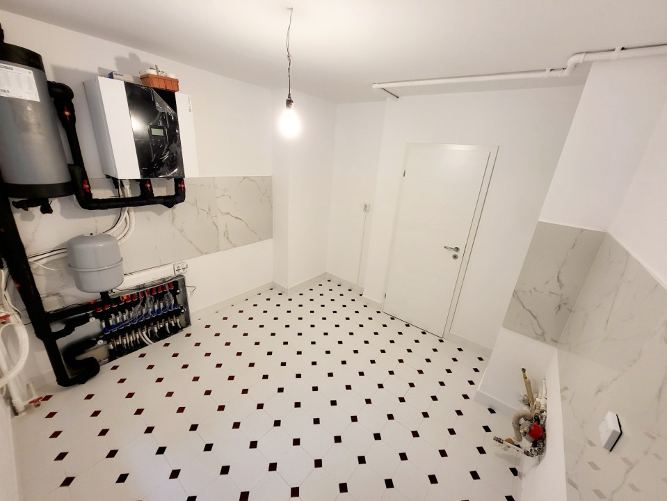 Solutia aleasa a fost utilizarea unei pompe de caldura aer-apa (Clivet, 6 kW), care orchestreaza incalzirea/ racirea locuintei. Incalzirea este realizata prin pardoseala (Uponor Tacker), iar racirea se realizeaza prin tavan si partial prin pereti (Uponor Minitec). Astfel s-a realizat cea mai sanatoasa stratificare termica a unui spatiu ( cald in zona talpilor, rece in zona capului). "Clima" apartamentului poate fi controlata din telefon prin aplicatia Uponor Smatrix.