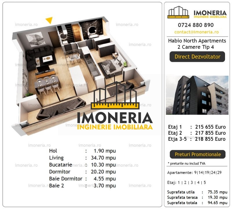 Preturile apartamentelor variaza in functie de etaj si sunt detaliate pe schita apartamentului din galeria foto.