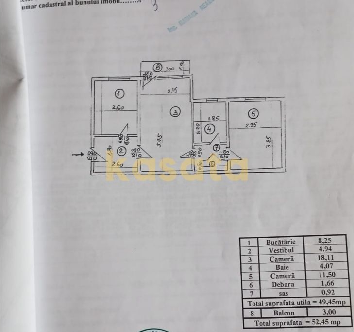 Apartamentul are o suprafata utila totala de 52,5 mp (inclusiv balcon de 3 mp) si este compartimentat semidecomandat, oferind un echilibru intre functionalitate si posibilitati de reamenajare.