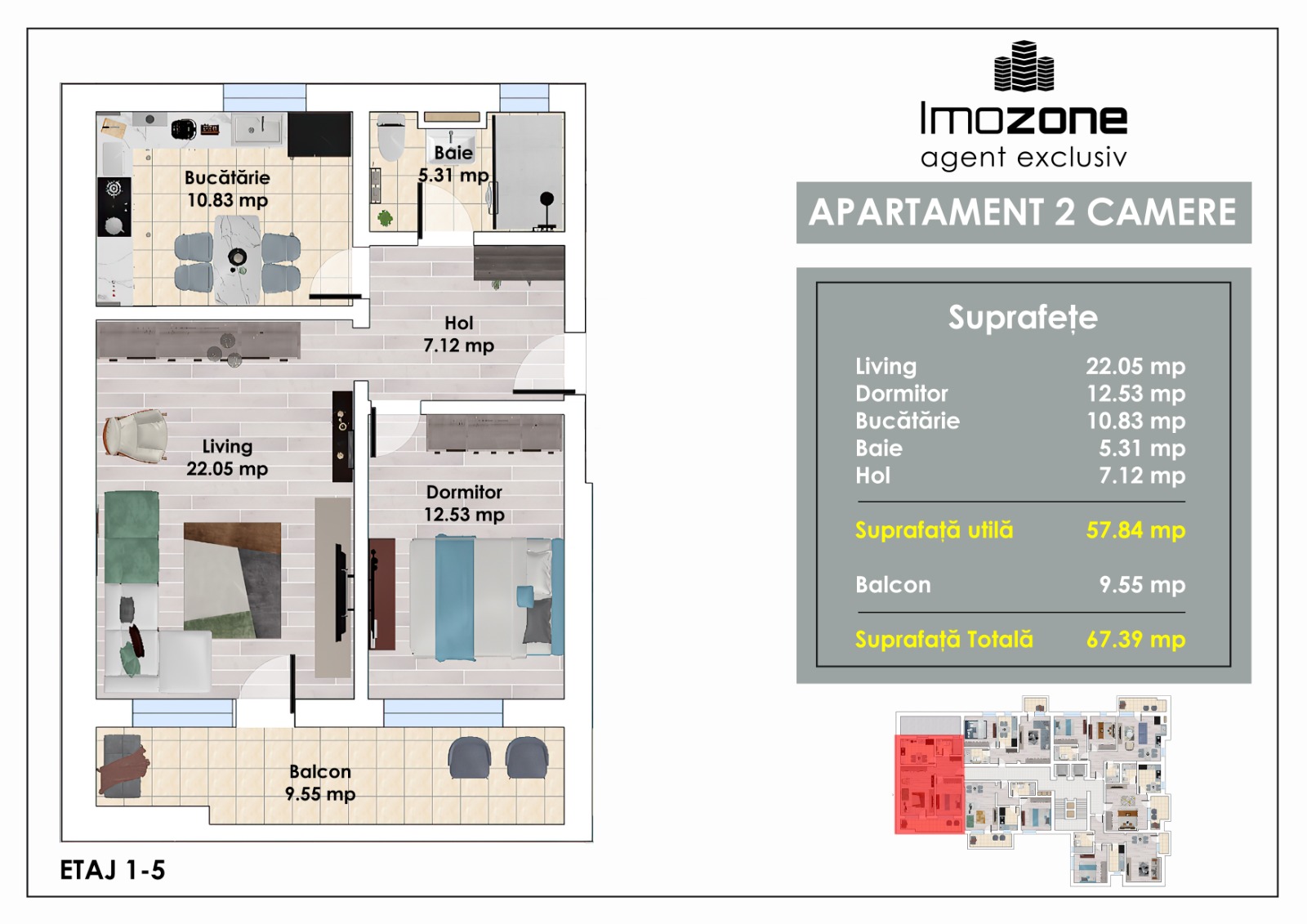 Acesta va fi finisat complet (gresie, faianta, parchet, obiecte sanitare montate, usi de interior, prize, intrerupatoare, centrala termica si calorifere).