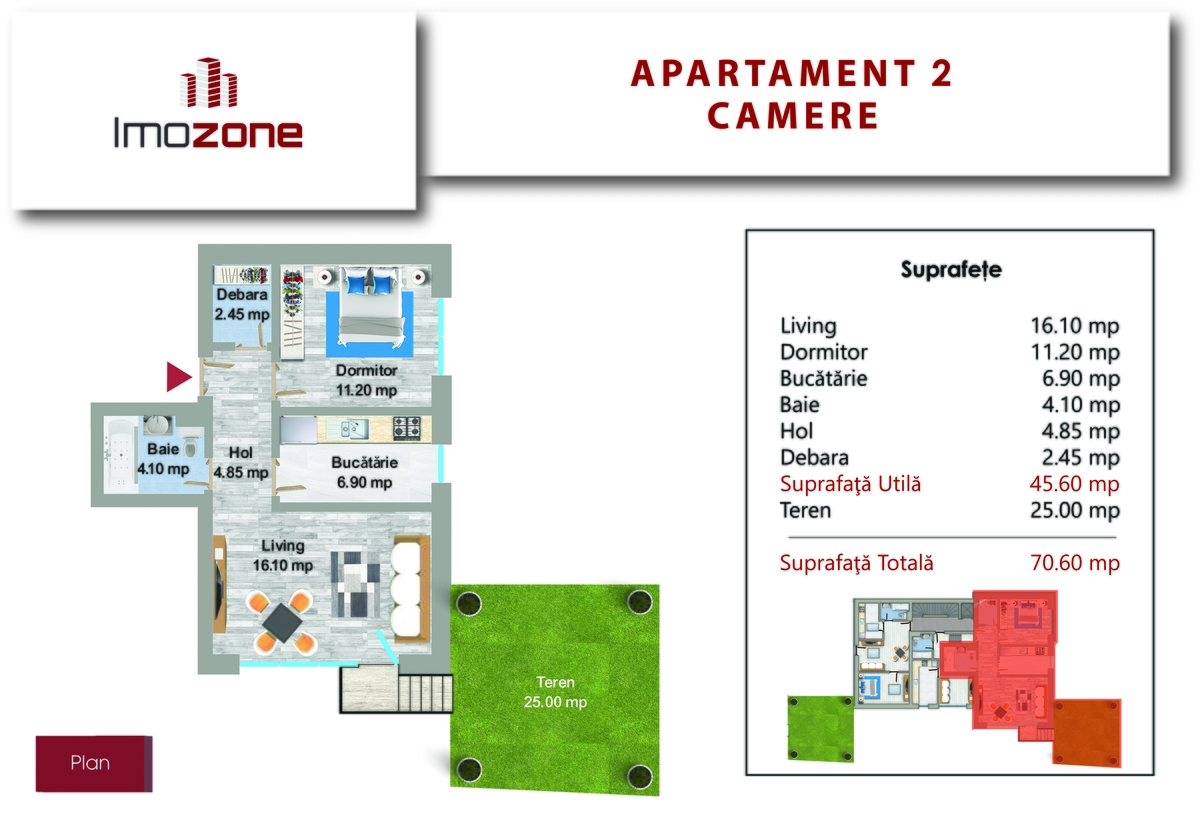 Noi iti propunem un apartament de decomandat, 2 camere cu teren in proprietate, bucatarie inchisa, centrala proprie, finisat la cheie, situat la la parter (inalt), intr-un imobil cu regim mic de inaltime The Building 74. Proprietatea dispune de o suprafata de 44 mp, bucatarie inchisa, parcare subterana sau supraterana, ce se achizitioneaza separat.