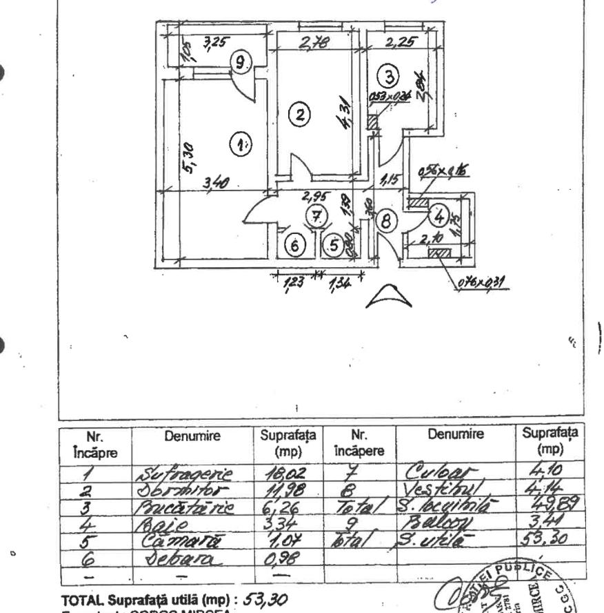 Apartamentul dispune de geamuri termopan, usi interior lemn, doua debarale, balcon, fara alte imbunatatiri, bloc reabilitat, doua lifturi, fiind compartimentat astfel :