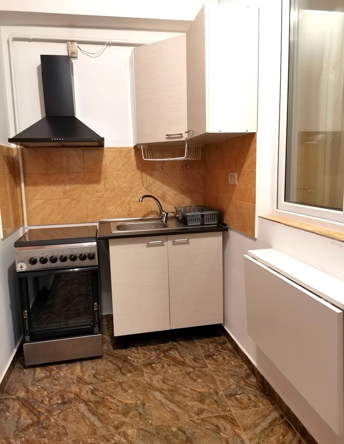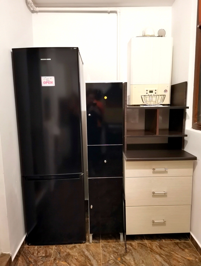Bucatarie complet utilata : aragaz mixt cu cuptor electric, hota, frigider heinner din gama limitata pe negru.