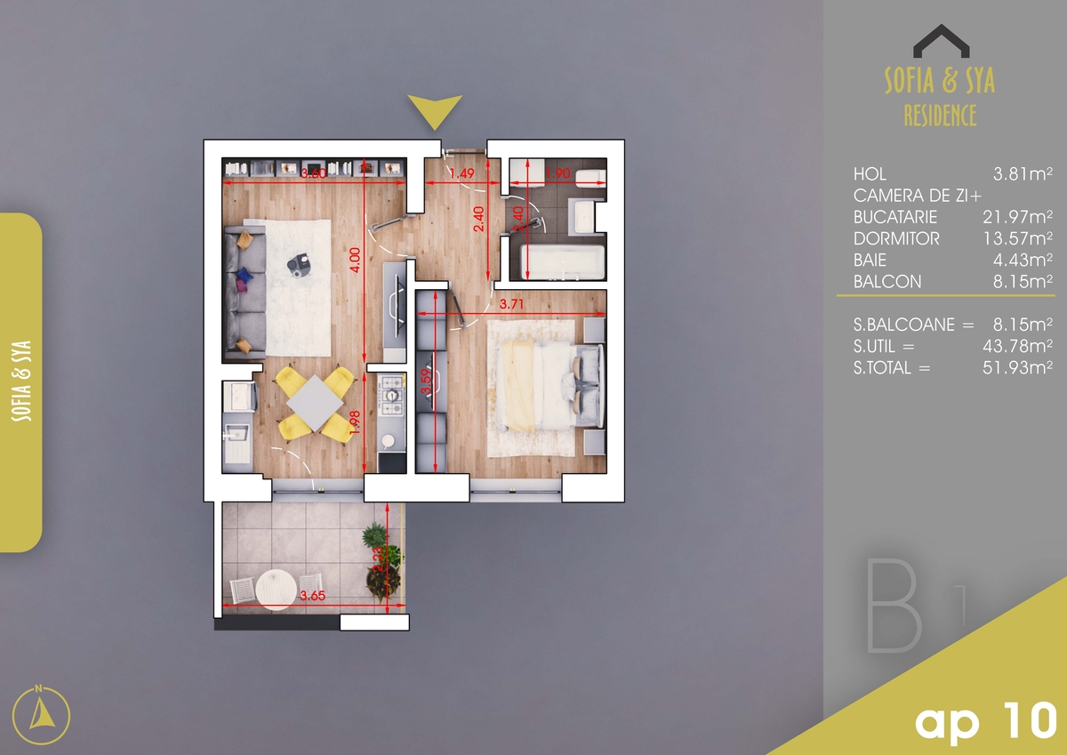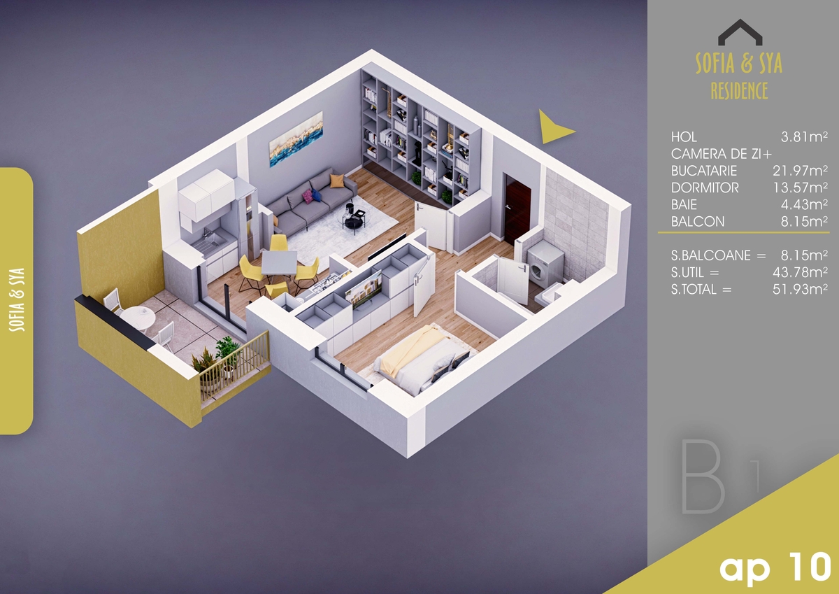 Apartamentul are o suprafata totala de 51.93 mp. Aceasta este alcatuita din: o camera de zi cu bucatarie, un dormitor, o baie, un hol si un balcon generos.