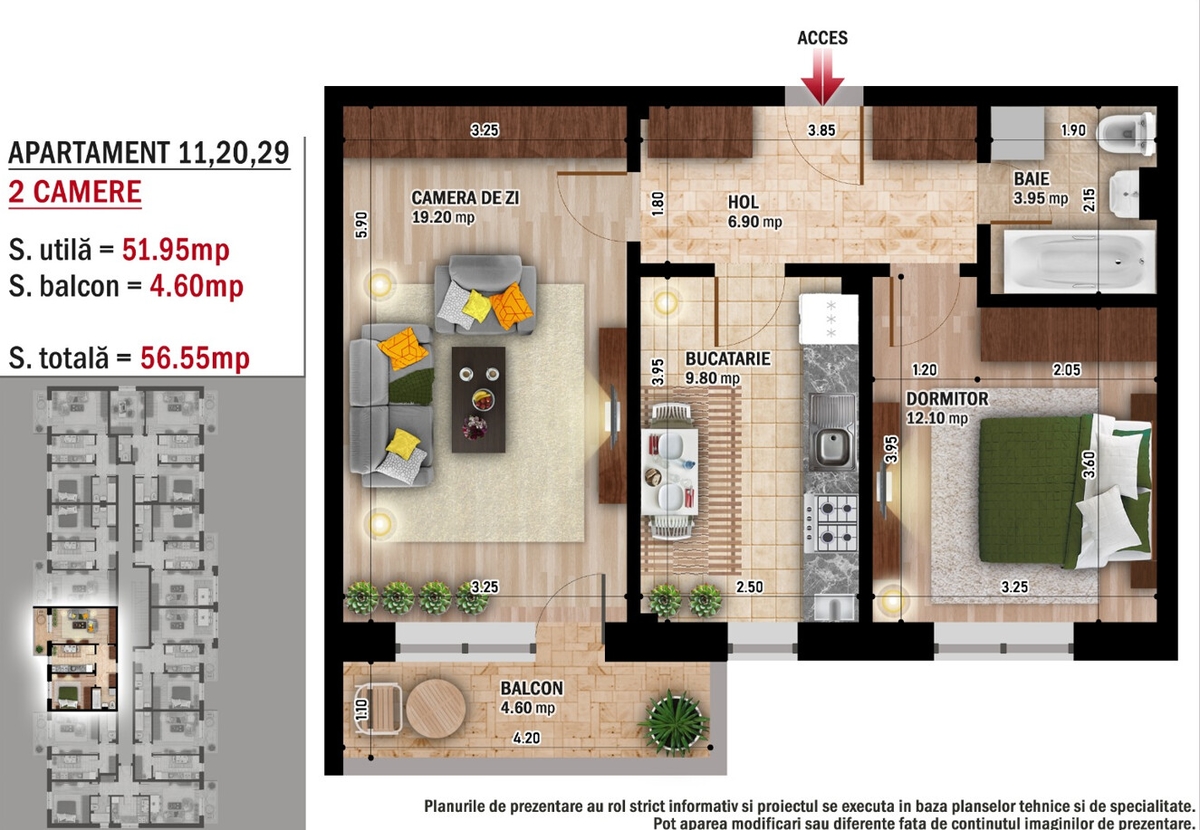 Apartamentul are o suprafata totala utila de 56.55mp, avand in componenta un balcon de 4.6mp.