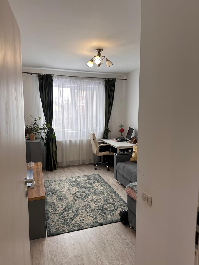 Apartamentul are vedere neobturata catre spatele blocului, situat intr-o zona cu densitate a constructiilor redusa (regim mic de inaltime al blocului, intr-o zona cu case si blocuri similare).