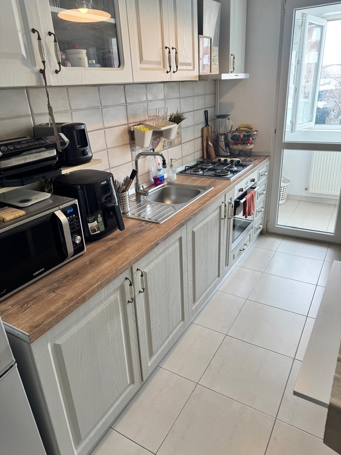 Bucataria este utilata (cu posibilitatea de a fi pastrata si cea mai mare parte din restul mobilierului care se vede in poze, in functie de optiunea cumparatorului, fara alte costuri suplimentare).