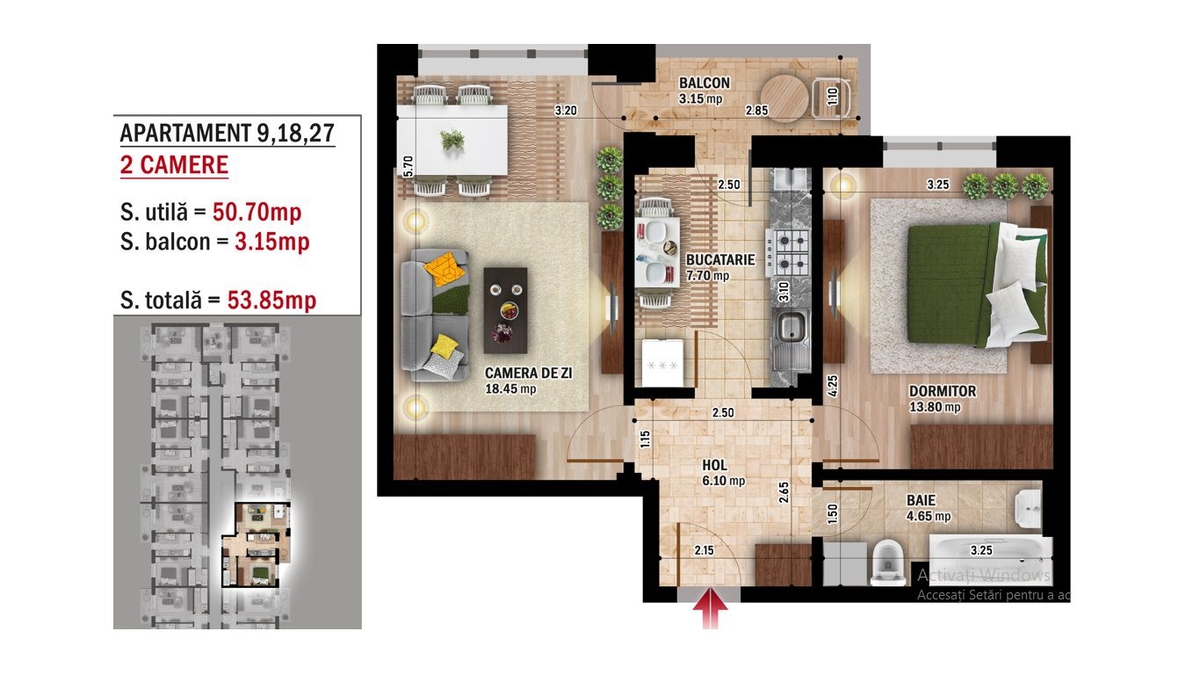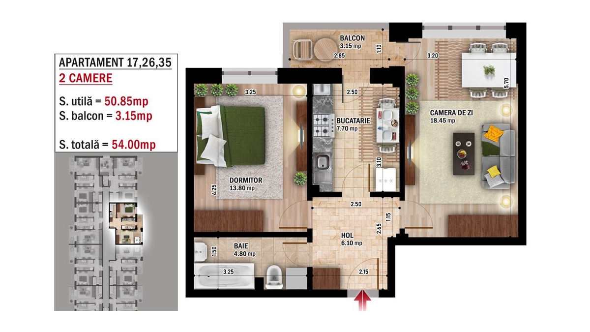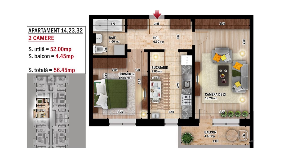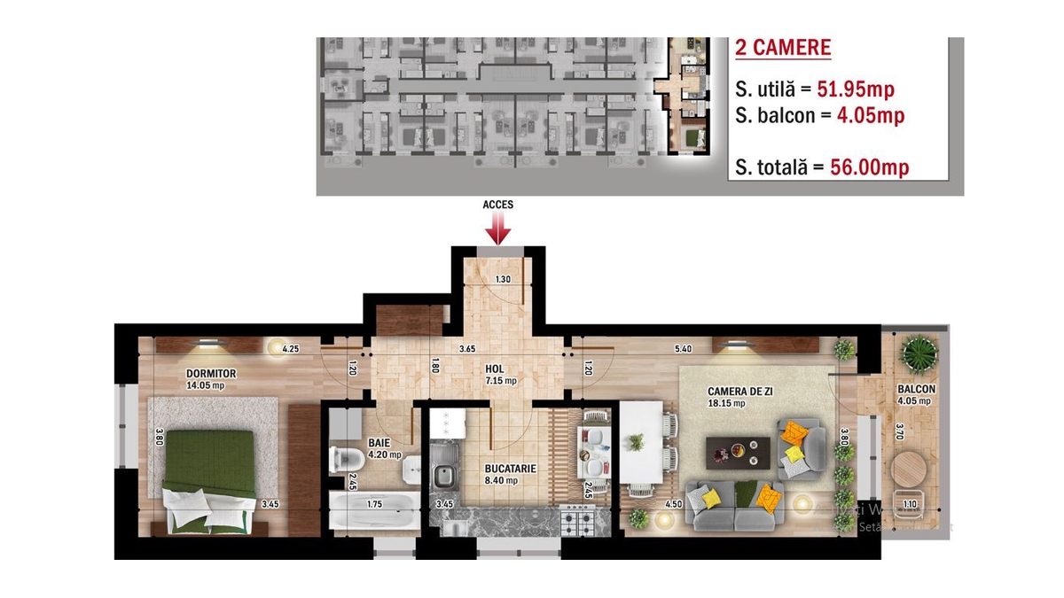 Ap decomandat avand suprafata utila de 53,85mp sau 54mp (51mp utili si 3mp balcon).