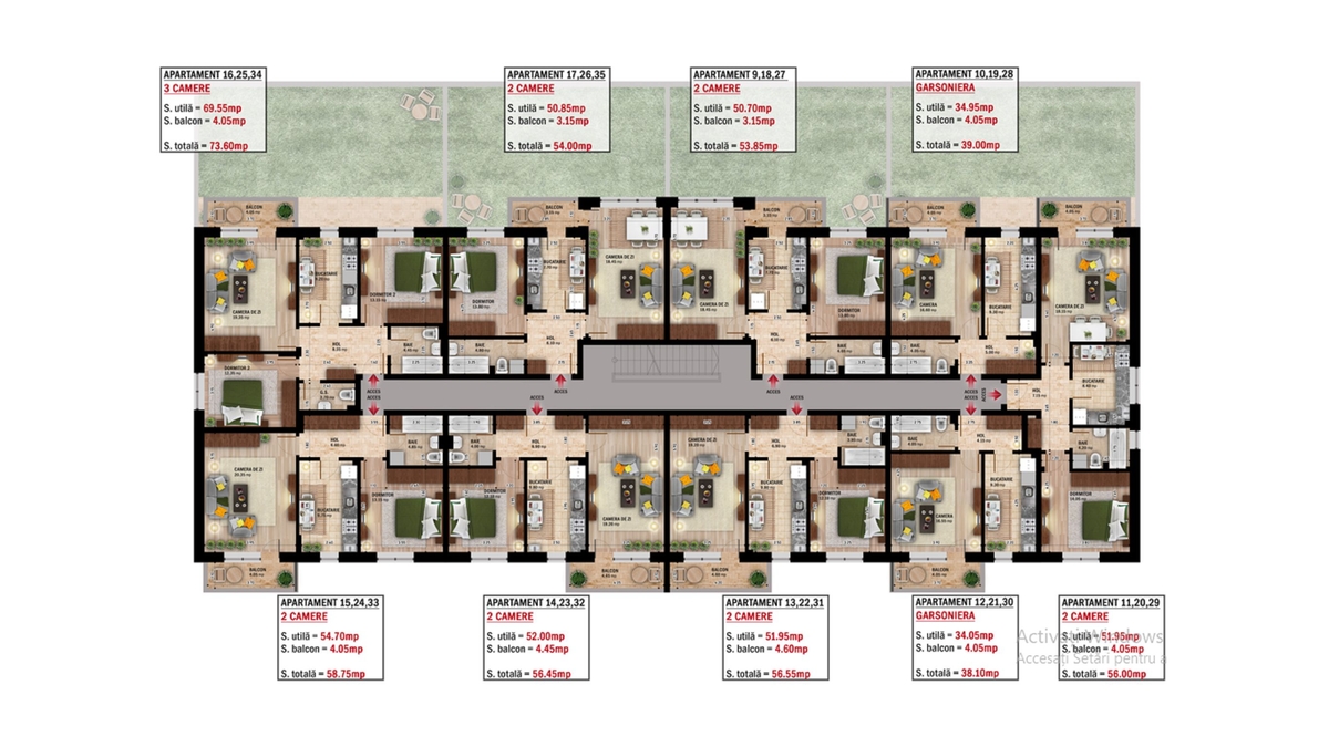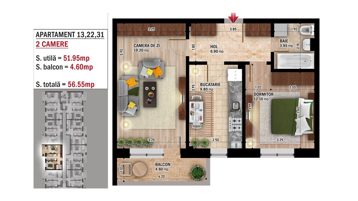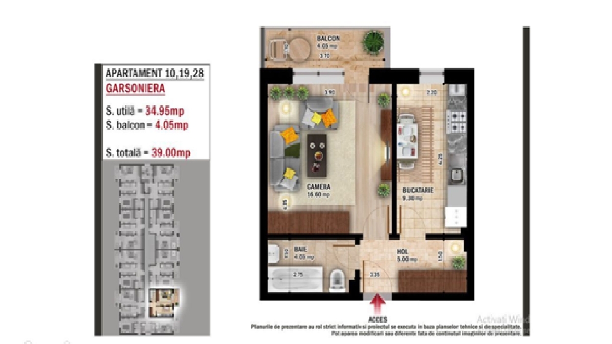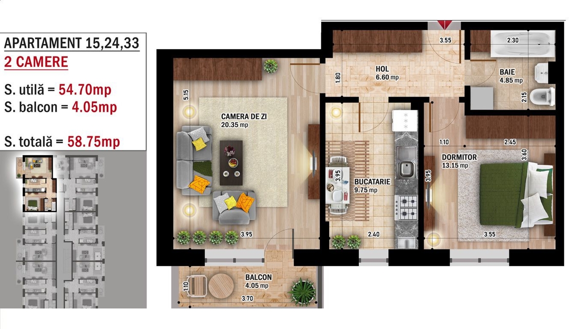 Ap decomandat avand suprafata utila de 53,85mp sau 54mp (51mp utili si 3mp balcon).