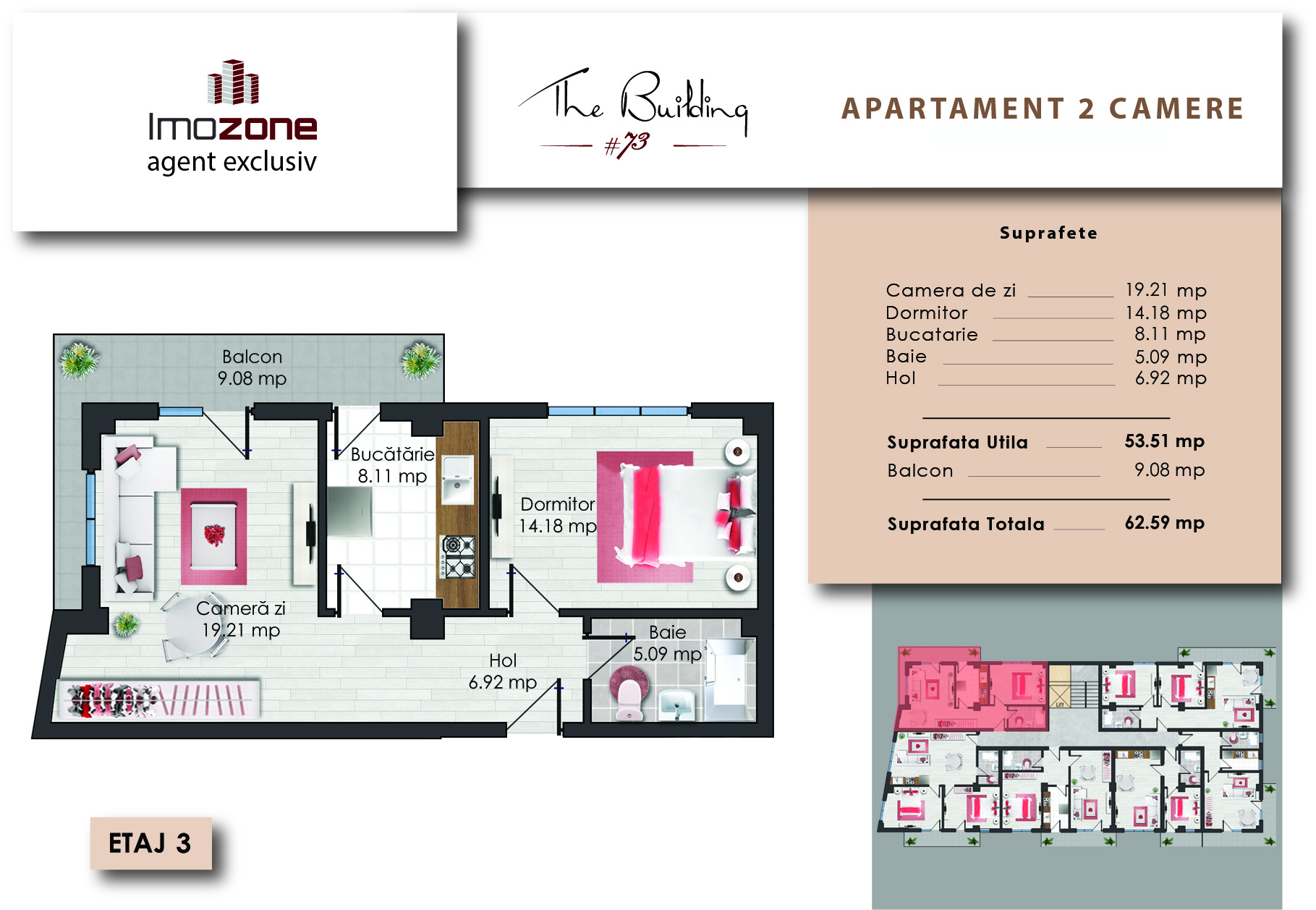 et. 3/3 Apartament 2 camere, decomandat, bucatarie inchisa, centrala proprie, balcon, contorizare individuala. Apartamentul se preda complet finisat, la cheie.